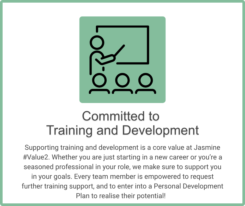 This approach is in place to ensure you get off to the best start at Jasmine, and to make sure we’re prioritising our team members’ wellbeing.